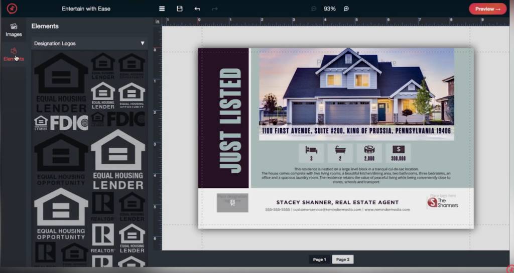 8. Click Elements on the left-side panel for designation logo choices.