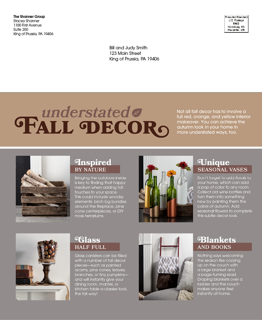 You can choose to personalize your magazine’s Front Cover, Back Cover, Back Inside Cover, and Tear Out Cards with your photo and info and can opt for eye-catching content for your ads, including real estate-focused ones, season-specific options, and recipes.